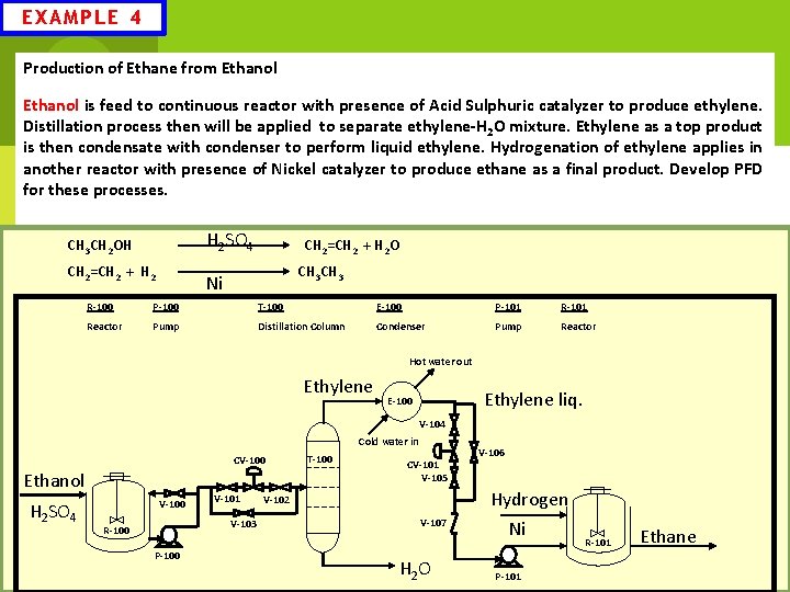 EXAMPLE 4 Production of Ethane from Ethanol is feed to continuous reactor with presence of Acid Sulphuric catalyzer to produce ethylene. Distillation process then will be applied to separate ethylene-H 2 O mixture. Ethylene as a top product is then condensate with condenser to perform liquid ethylene. Hydrogenation of ethylene applies in another reactor with presence of Nickel catalyzer to produce ethane as a final product. Develop PFD for these processes. H 2 SO 4 CH 3 CH 2 OH CH 2=CH 2 + H 2 O CH 3 Ni R-100 P-100 T-100 E-100 P-101 Reactor Pump Distillation Column Condenser Pump Reactor Hot water out Ethylene liq. E-100 V-104 Cold water in CV-100 Ethanol H 2 SO 4 V-100 V-101 V-103 R-100 P-100 T-100 CV-101 V-105 V-106 Hydrogen V-102 V-107 H 2 O Ni P-101 R-101 Ethane