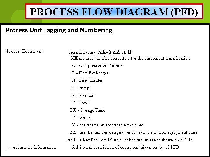 PROCESS FLOW DIAGRAM (PFD) Process Unit Tagging and Numbering Process Equipment General Format XX-YZZ A/B XX are the identification letters for the equipment classification C - Compressor or Turbine E - Heat Exchanger H - Fired Heater P - Pump R - Reactor T - Tower TK - Storage Tank V - Vessel Y - designates an area within the plant ZZ - are the number designation for each item in an equipment class A/B - identifies parallel units or backup units not shown on a PFD Supplemental Information Additional description of equipment given on top of PFD