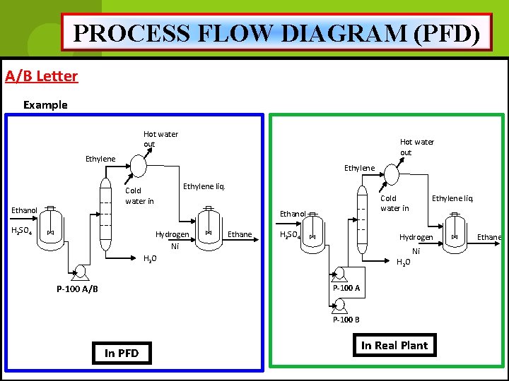 PROCESS FLOW DIAGRAM (PFD) A/B Letter Example Hot water out Ethylene Cold water in Ethanol Ethylene liq. Cold water in Ethanol H 2 SO 4 Hydrogen Ni H 2 O Ethane H 2 SO 4 Ethylene liq. Hydrogen H 2 O Ni P-100 A/B P-100 B In PFD In Real Plant Ethane
