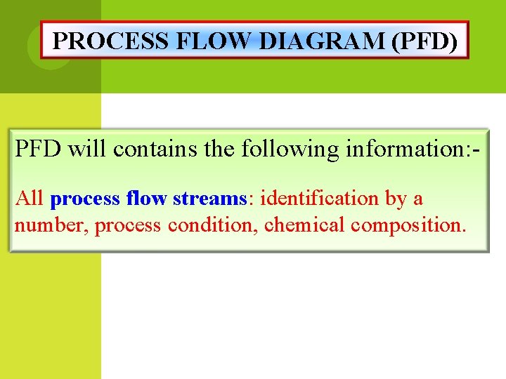 PROCESS FLOW DIAGRAM (PFD) PFD will contains the following information: All process flow streams: identification by a number, process condition, chemical composition.