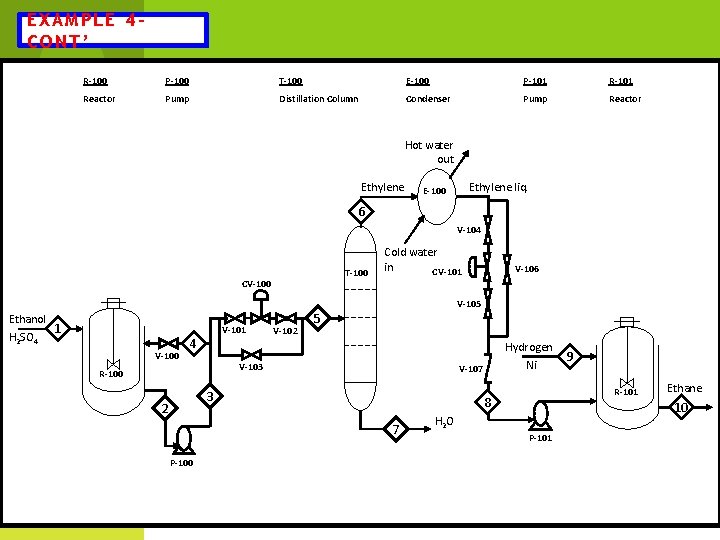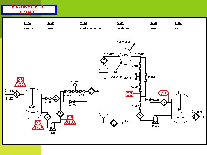 EXAMPLE 4 CONT’ R-100 P-100 T-100 E-100 P-101 Reactor Pump Distillation Column Condenser Pump Reactor Hot water out Ethylene liq. E-100 6 V-104 25 28 Ethanol H 2 SO 4 T-100 CV-100 1 V-100 V-101 4 35 32. 2 3 P-100 35 31. 0 V-106 V-105 5 20 38 V-103 R-100 2 V-102 Cold water in CV-101 Hydrogen Ni V-107 R-101 8 7 9 H 2 O P-101 Ethane 10