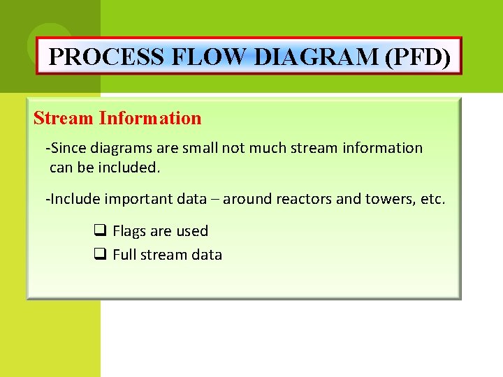 PROCESS FLOW DIAGRAM (PFD) Stream Information -Since diagrams are small not much stream information can be included. -Include important data – around reactors and towers, etc. q Flags are used q Full stream data