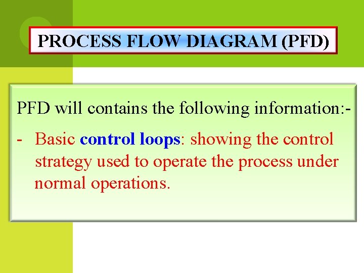 PROCESS FLOW DIAGRAM (PFD) PFD will contains the following information: - Basic control loops: showing the control strategy used to operate the process under normal operations.