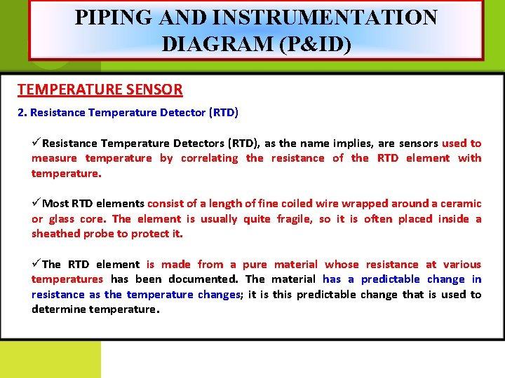 PIPING AND INSTRUMENTATION DIAGRAM (P&ID) TEMPERATURE SENSOR 2. Resistance Temperature Detector (RTD) üResistance Temperature Detectors (RTD), as the name implies, are sensors used to measure temperature by correlating the resistance of the RTD element with temperature. üMost RTD elements consist of a length of fine coiled wire wrapped around a ceramic or glass core. The element is usually quite fragile, so it is often placed inside a sheathed probe to protect it. üThe RTD element is made from a pure material whose resistance at various temperatures has been documented. The material has a predictable change in resistance as the temperature changes; it is this predictable change that is used to determine temperature.