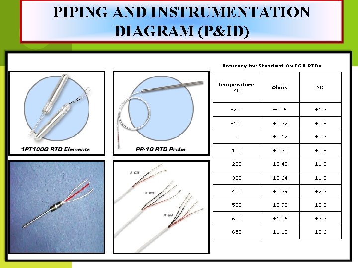 PIPING AND INSTRUMENTATION DIAGRAM (P&ID) Accuracy for Standard OMEGA RTDs Temperature °C Ohms °C -200 ± 056 ± 1. 3 -100 ± 0. 32 ± 0. 8 0 ± 0. 12 ± 0. 3 100 ± 0. 30 ± 0. 8 200 ± 0. 48 ± 1. 3 300 ± 0. 64 ± 1. 8 400 ± 0. 79 ± 2. 3 500 ± 0. 93 ± 2. 8 600 ± 1. 06 ± 3. 3 650 ± 1. 13 ± 3. 6