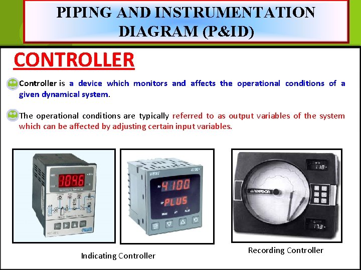 PIPING AND INSTRUMENTATION DIAGRAM (P&ID) CONTROLLER Controller is a device which monitors and affects the operational conditions of a given dynamical system. The operational conditions are typically referred to as output variables of the system which can be affected by adjusting certain input variables. Indicating Controller Recording Controller