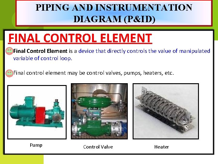 PIPING AND INSTRUMENTATION DIAGRAM (P&ID) FINAL CONTROL ELEMENT Final Control Element is a device that directly controls the value of manipulated variable of control loop. Final control element may be control valves, pumps, heaters, etc. Pump Control Valve Heater