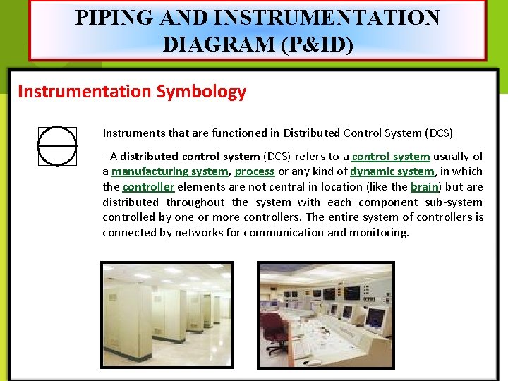 PIPING AND INSTRUMENTATION DIAGRAM (P&ID) Instrumentation Symbology Instruments that are functioned in Distributed Control System (DCS) - A distributed control system (DCS) refers to a control system usually of a manufacturing system, process or any kind of dynamic system, in which the controller elements are not central in location (like the brain) but are distributed throughout the system with each component sub-system controlled by one or more controllers. The entire system of controllers is connected by networks for communication and monitoring.