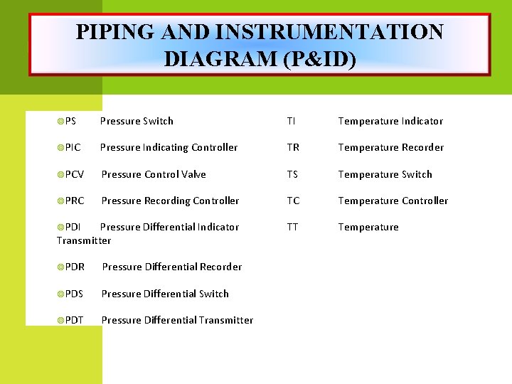 PIPING AND INSTRUMENTATION DIAGRAM (P&ID) PS Pressure Switch TI Temperature Indicator PIC Pressure Indicating Controller TR Temperature Recorder PCV Pressure Control Valve TS Temperature Switch PRC Pressure Recording Controller TC Temperature Controller PDI Pressure Differential Indicator TT Temperature Transmitter PDR Pressure Differential Recorder PDS Pressure Differential Switch PDT Pressure Differential Transmitter
