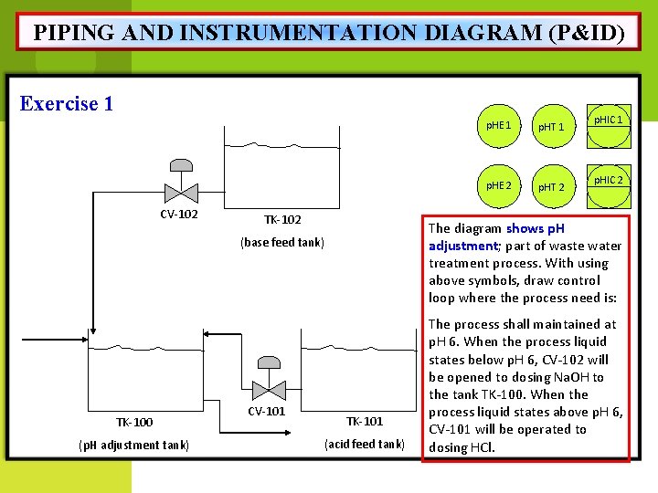 PIPING AND INSTRUMENTATION DIAGRAM (P&ID) Exercise 1 CV-102 TK-102 (p. H adjustment tank) CV-101 p. HT 1 p. HE 2 p. HT 2 p. HIC 1 p. HIC 2 The diagram shows p. H adjustment; part of waste water treatment process. With using above symbols, draw control loop where the process need is: (base feed tank) TK-100 p. HE 1 TK-101 (acid feed tank) The process shall maintained at p. H 6. When the process liquid states below p. H 6, CV-102 will be opened to dosing Na. OH to the tank TK-100. When the process liquid states above p. H 6, CV-101 will be operated to dosing HCl.