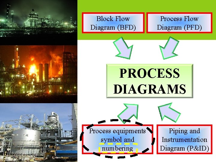 Block Flow Diagram (BFD) Process Flow Diagram (PFD) PROCESS DIAGRAMS Process equipments symbol and numbering Piping and Instrumentation Diagram (P&ID)