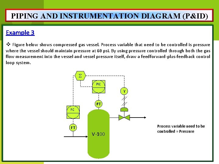 PIPING AND INSTRUMENTATION DIAGRAM (P&ID) Example 3 v Figure below shows compressed gas vessel. Process variable that need to be controlled is pressure where the vessel should maintain pressure at 60 psi. By using pressure controlled through both the gas flow measurement into the vessel and vessel pressure itself, draw a feedforward-plus-feedback control loop system. PIC Y PT FC FT V-100 Process variable need to be controlled = Pressure