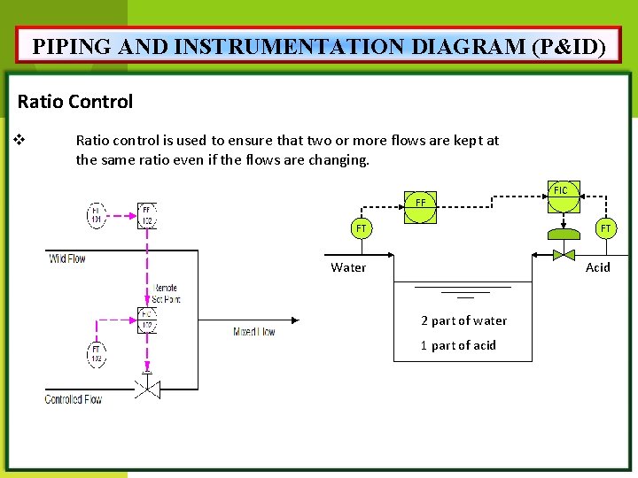 PIPING AND INSTRUMENTATION DIAGRAM (P&ID) Ratio Control v Ratio control is used to ensure that two or more flows are kept at the same ratio even if the flows are changing. FF FIC FT FT Water Acid 2 part of water 1 part of acid