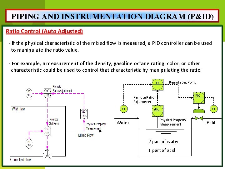 PIPING AND INSTRUMENTATION DIAGRAM (P&ID) Ratio Control (Auto Adjusted) - If the physical characteristic of the mixed flow is measured, a PID controller can be used to manipulate the ratio value. - For example, a measurement of the density, gasoline octane rating, color, or other characteristic could be used to control that characteristic by manipulating the ratio. FF Remote Set Point FIC Remote Ratio Adjustment FT Water FT AIC Physical Property Measurement 2 part of water 1 part of acid Acid