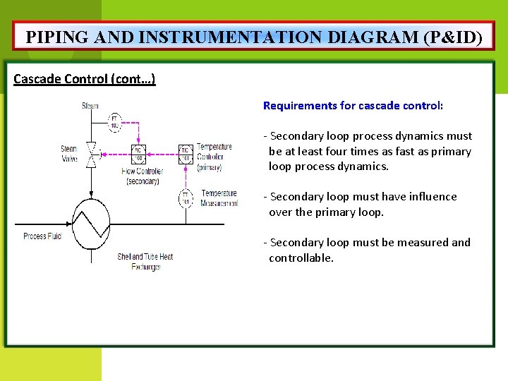 PIPING AND INSTRUMENTATION DIAGRAM (P&ID) Cascade Control (cont…) Requirements for cascade control: - Secondary loop process dynamics must be at least four times as fast as primary loop process dynamics. - Secondary loop must have influence over the primary loop. - Secondary loop must be measured and controllable.
