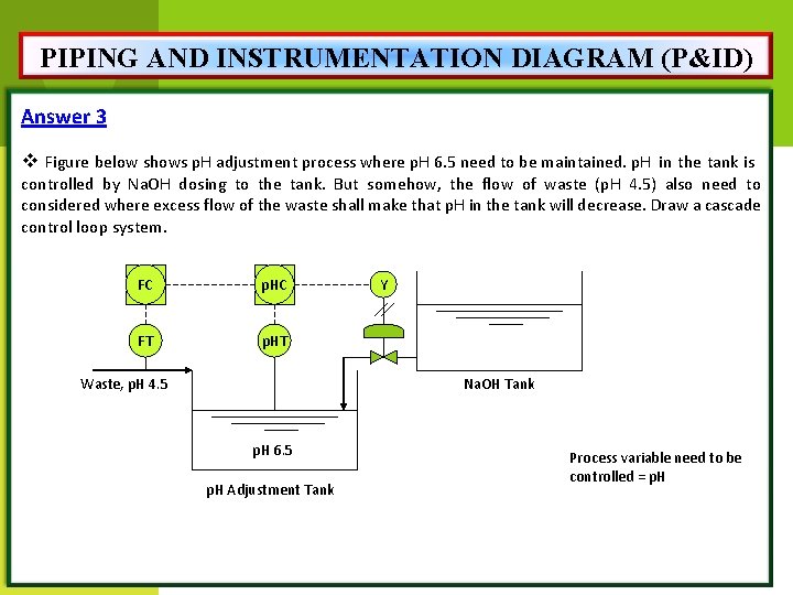 PIPING AND INSTRUMENTATION DIAGRAM (P&ID) Answer 3 v Figure below shows p. H adjustment process where p. H 6. 5 need to be maintained. p. H in the tank is controlled by Na. OH dosing to the tank. But somehow, the flow of waste (p. H 4. 5) also need to considered where excess flow of the waste shall make that p. H in the tank will decrease. Draw a cascade control loop system. FC p. HC FT p. HT Waste, p. H 4. 5 Y Na. OH Tank p. H 6. 5 p. H Adjustment Tank Process variable need to be controlled = p. H