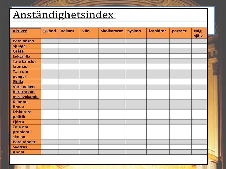 Begreppen Inramningen: Den fysiska miljön. Var äger handlingen rum och hur ser det ut där? Rollen: Vilka förväntningar finns det på den roll jag intar? Klarar jag av detta? Publiken: Hur reagerar de som lyssnar på mig, eller är föremål för mina handlingar? Ger de positiv feedback eller tvärtom negativ? Fasaden: Team: Finns det personer kring mig som stödjer mig och mitt agerande? Är jag den jag utger mig för att vara och som jag i denna situation vill vara? Ger jag rätt signaler i denna situation?