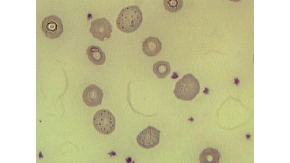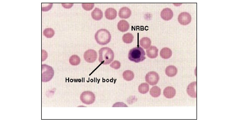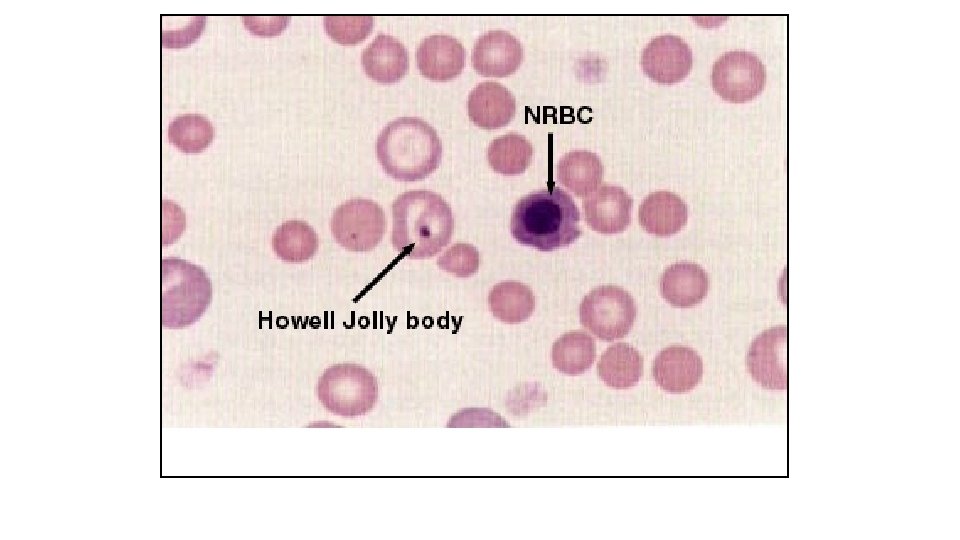 Howell-Jolly Bodies • Basophilic nuclear remnants • Seen in young RBCs in response to anemia • Phagocytes in spleen remove these remnants