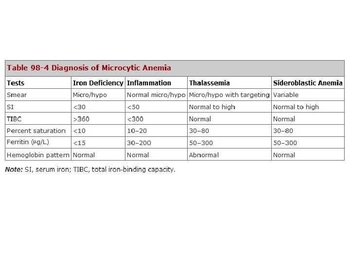 Laboratory iron studies • Serum iron(SI) / Total iron-binding capacity(TIBC) : 50 -150/300 -360 µg/d. L (N) • Serum ferritin : < 15 µg/L • Bone Marrow iron stores : stainable iron, sideroblast, ringed sideroblast (MDS) • • Red cell protoporhyrin levels : > 100 µg/d. L Soluble transferrin receptor (s. Tf. R) : 4 -9 µg/L (N) Percent hypochromic red cell (% Hypo) Hepcidin