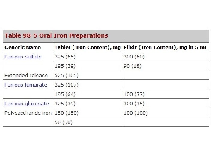 Treatment of iron-deficiency anemia • • Diet : heme iron RBC transfusion Oral iron therapy Parenteral iron therapy – Iron dextran – Sodium ferric gluconate – Iron sucrose – Ferric chloride