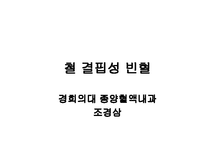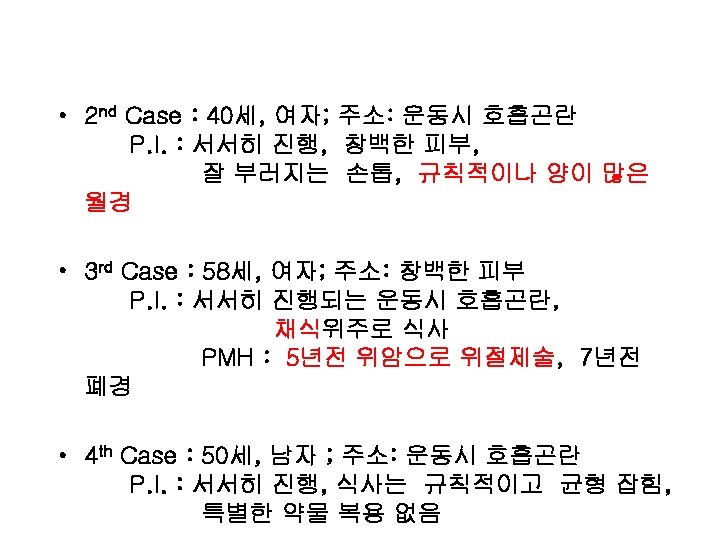 1 st Case 25세, 여자; 주소: 창백한 피부 • P. I. : 서서히 시작된 운동시 호흡곤란, 불규칙한 월경, 채식 위주로 식사 • CBC : RBC : 3, 200, 000/u. L, Hb : 7. 4 g/d. L, Hct : 23% MCV : 72 f. L(81 -99), MCH : 23. 1 pg/cell(27 -31), MCHC : 32. 1 g/d. L(33 -37) WBC : 8, 500/u. L, Platelet : 485, 000/u. L • Peripheral blood smear : Hypochromic, microcytic, anisocytosis (++), pikilocytosis (+) • Chemistry : serum Fe : 26 ug/d. L, TIBC : 460 ug/d. L Ferritin : 15 ng/m. L