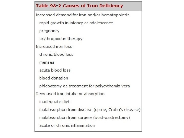 Absolute iron deficiency Dietary (growth/development) Women’s health Pregnancy/breast feeding Menstrual blood losses Chronic blood loss Blood donation Nonsteroidal anti-inflammatory drugs (NSAIDs) Gastrointestinal neoplasms Gastrointestinal parasites (developing countries) Decreased iron absorption Celiac disease Helicobacter pylori infection Autoimmune atrophic gastritis Functional iron deficiency ESA therapy
