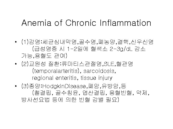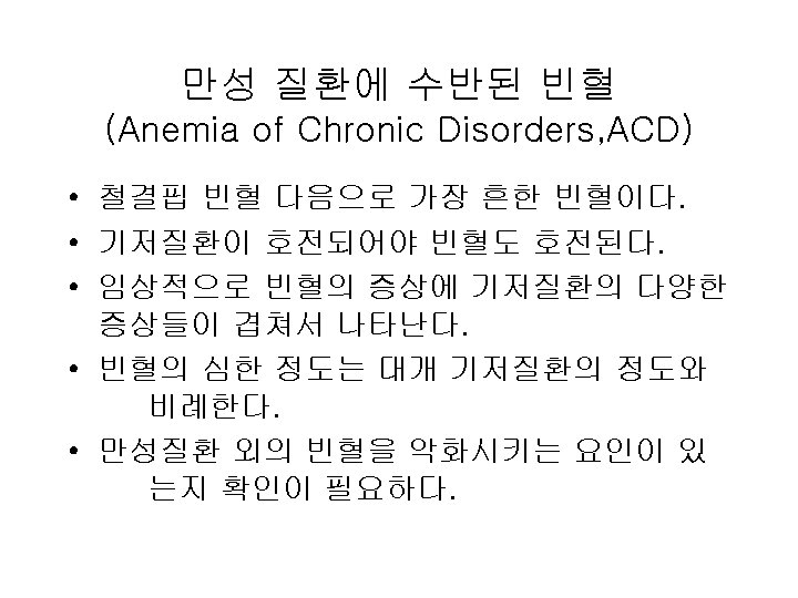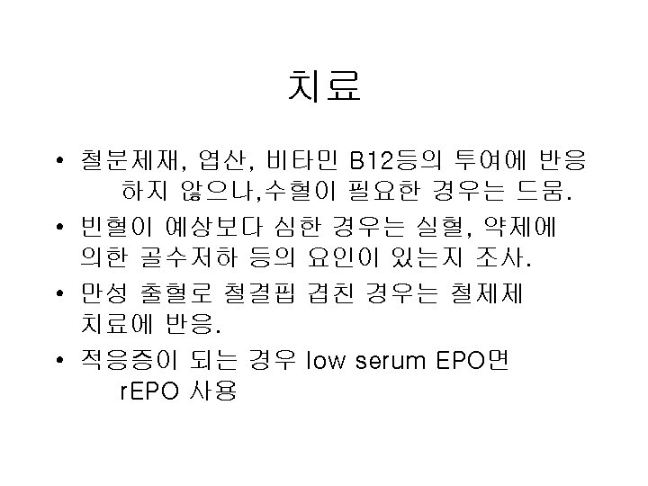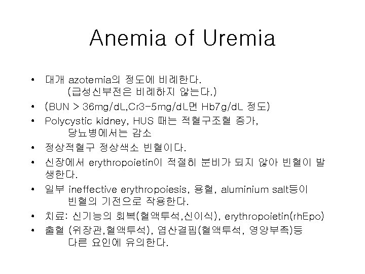 Anemia of Hypometabolism: 산소요구량 감소에 의한 적혈구조혈 감소 • Anemia due to Endocrine Failure – hypothyroidism, Addison'sdisease, hypogonadism, panhypopituitarism, hyperparathyroidism – Addison'sdisease 치료시 plama volume 감소가 교정되면서 잠시 혈색소 치는 감소하기도 한다. • Anemia of Liver Disease – – – • Anemia of Protein Deprivation: – • Cholesterol 증가: Burrcell, stomatocyte RBC 수명 단축, 골수 보상 활동 저하 alcohol: 골수에 독성, 엽산결핍, 철결핍(위장관 출혈, 식이 부족) volume depletion으로 masking 가능 치료: – – 수혈: 증상에 따라 결정. CV or pulm disease, elderly , risk of transfusion Erythropoietin(EPO) w/o iron: 4 -6주에 Hb 10 -12 g/d. L 도달. Decreased response: infection, iron del[etion, Al toxicity, hyperparathyroidism Long actin EPO
