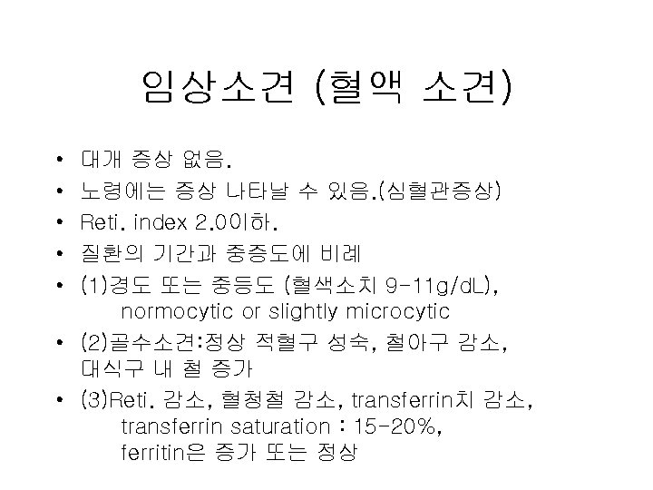 진단 • 1 st case : blood loss (mense), diet (+), demend (? ) • 2 nd case: blood loss (mense), diet (? ), demend (-): gynecological problem • 3 rd case : blood loss (-), diet (+), demend (-) : absorption (gastrectomy) • 4 th case : blood loss (? ), diet (-), demend (-) : cause of blood loss