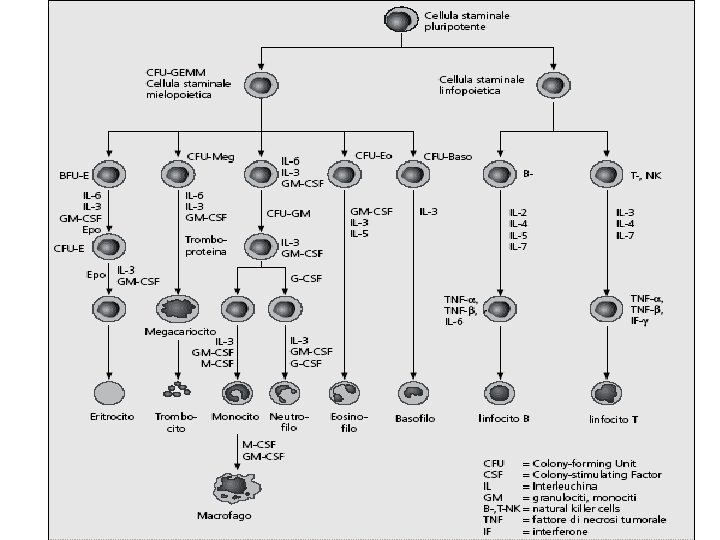Eritropoiesi (Formazione di GR) • 1. La cellula iniziale è una BFU-E (burst forming unit – erythroid) • 2. BFU-E in presenza di interleukina-3 ed eritropoietina forma CFU-E (colony forming units – erythroid) • 3. CFU-E in presenza di un’alta concentrazione di eritropoietina forma pro-normoblasti.