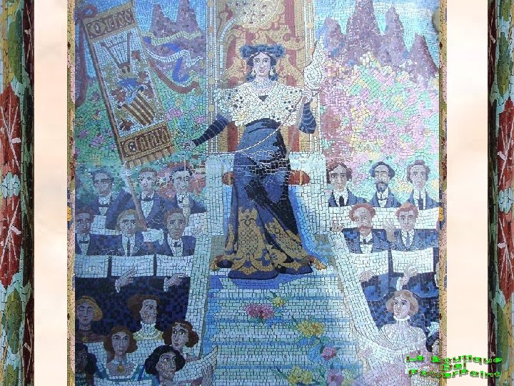LA FIGURA DE SAN JORGE, COMO PATRÓN DE LA NACIÓN CATALANA, OCUPA LA POSICIÓN CENTRAL, VELANDO POR EL PUEBLO CATALÁN. EN LAS DIAPOSITIVAS SIGUIENTES, LAS IMÁGENES REPRESENTAN AL PUEBLO.