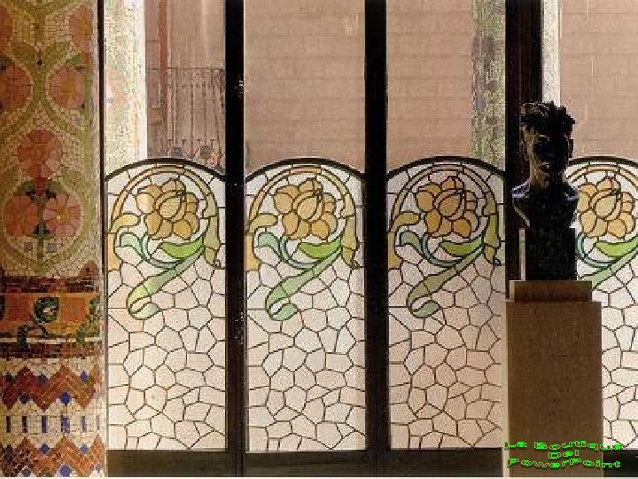 VIDRIERAS MULTICOLORES CON MOTIVOS FLORALES Y MUSICALES. LA TEXTURA DEL VIDRIO TAMIZA LA LUZ EN MÚLTIPLES COLORES.