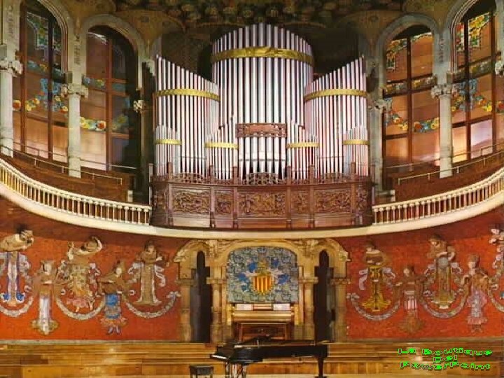 El escenario está dominado en su parte trasera por los tubos el órgano, que se convierten a su vez en un elemento decorativo e icono del propio Palau. La embocadura del escenario está enmarcada por ilustraciones escultóricas espectaculares, sendas alegorías de la música culta y de la música popular. A la derecha, un busto Ludwig Van Beethoven sobre las columnas dóricas que sostienen unos cúmulos de los que emerge la cabalgata de las walquirias (clara referencia a la adoración por Richard Wagner que siempre ha tenido el público catalán ).