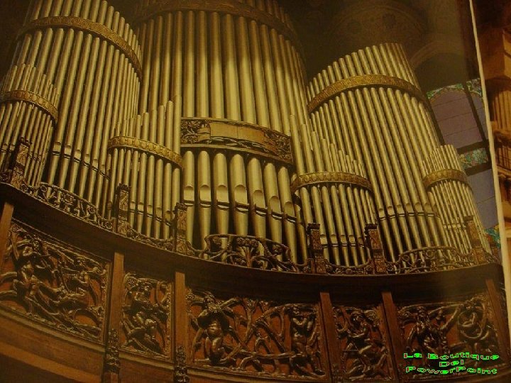 El escenario está dominado en su parte trasera por los tubos el órgano, que se convierten a su vez en un elemento decorativo e icono del propio Palau. La embocadura del escenario está enmarcada por ilustraciones escultóricas espectaculares, sendas alegorías de la música culta y de la música popular. A la derecha, un busto Ludwig Van Beethoven sobre las columnas dóricas que sostienen unos cúmulos de los que emerge la cabalgata de las walquirias (clara referencia a la adoración por Richard Wagner que siempre ha tenido el público catalán ).