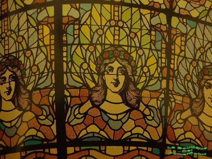 VIDRIERAS MULTICOLORES CON MOTIVOS FLORALES Y MUSICALES. LA TEXTURA DEL VIDRIO TAMIZA LA LUZ EN MÚLTIPLES COLORES.