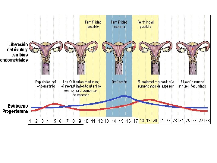 • • • Estrógenos Ovulación Menarquia - Menstruación Ensanchan caderas Crecen senos Cambios en la vagina