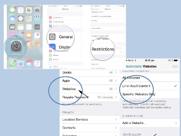 How to restrict access on Apple products • Limit what your child can use on a device by turning on restrictions. • You can restrict the content e. g. websites and searches, music, apps and films.