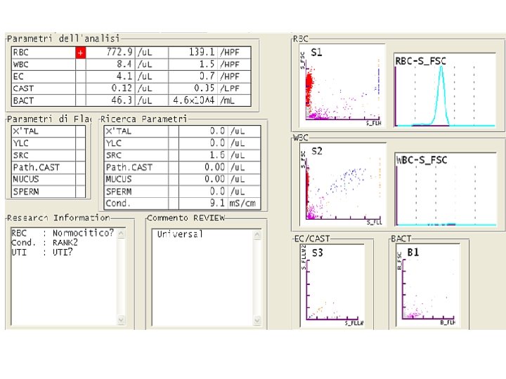RISULTATI Secondo la European Confederation of Laboratory Medicine (ECML) l’espressione dei risultati dei parametri sia microscopici che chimici deve essere quantitativa e semiquantitativa. I parametri chimici: proteine, esterasi leucocitaria, pseudo-perossidasi (emoglobina) e nitriti dovranno essere quindi quantificati così come pure le cellule e gli altri corpuscoli presenti nel campione, espressi come numero medio per campo o per microlitro.