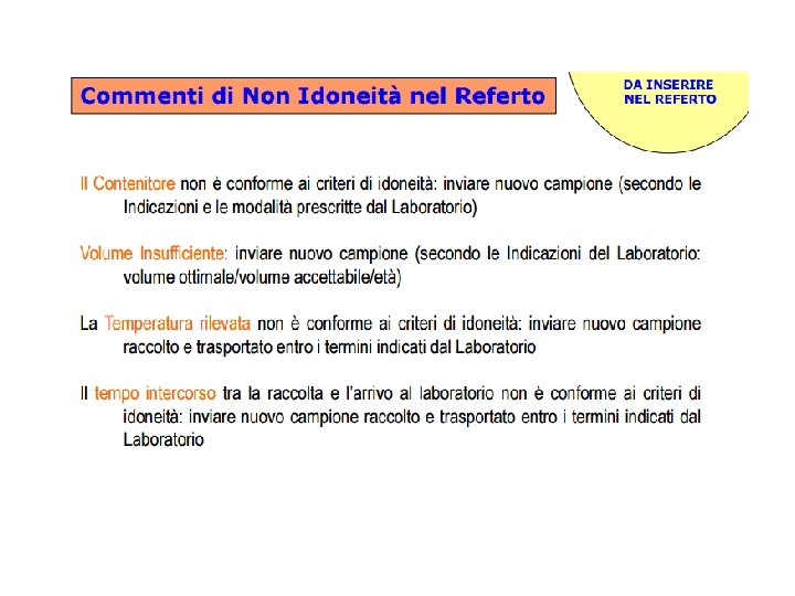 Raccomandazione L’etichetta apposta sul contenitore deve riportare tutti i dati necessari alla identificazione certa del paziente, del campione e degli accertamenti da eseguire. CRITERI DI NON ACCETTABILITA’ DEL CAMPIONE • in fase preanalitica QUANTITA’ INSUFFICIENTE: ADULTI: < 5 CC quantità ottimale 10 cc BAMBINI (<4 anni): < 3 cc quantità ottimale > 5 cc Cosa fare In caso di Non conformita’ ? • 1. Nota: Campione insufficiente o……….