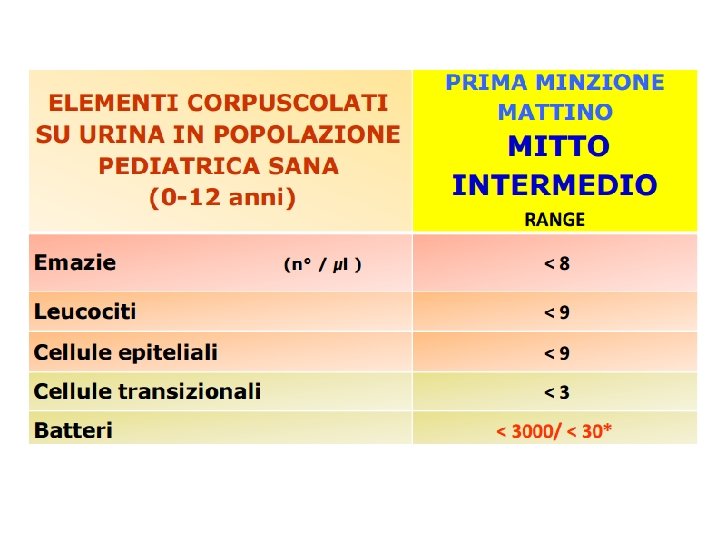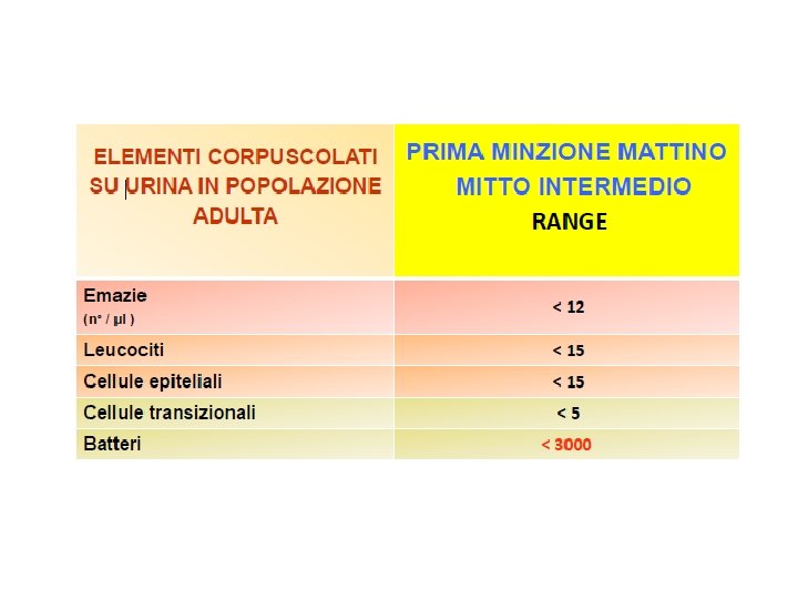 ASPETTO q. LIMPIDA : NORMALE q. TORBIDA O MOLTO TORBIDA: • deposizione di sali sul fondo per sedimento spontaneo di: Fosfati e Urati • se torbidità già all’emissione dovuta a: - Muco - Cilindri - Cellule epiteliali - Infezione urinaria - Sangue - Renella (sabbia finissima costituita da sali minerali)