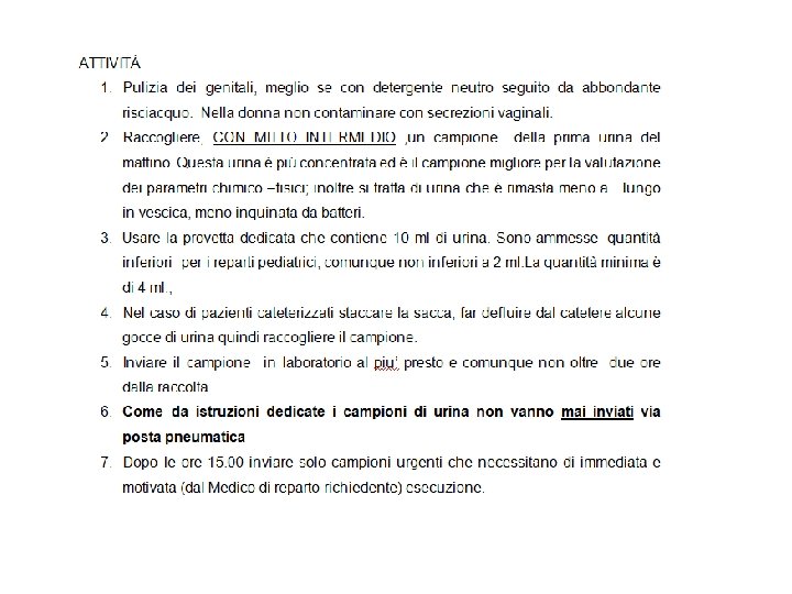 Conformità tra le istruzioni operative e le linee guida • MITTO INTERMEDIO, PRIMA URINA DEL MATTINO • VOLUME MINIMO DI URINA : 2 ML PER PAZIENTI PEDIATRICI E 4 ML PER ADULTI • INVIARE IL CAMPIONE NON OLTRE LE DUE ORE DOPO LA RACCOLTA