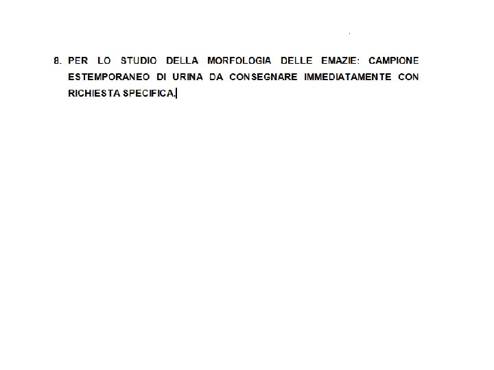 1. RICHIESTA DELL’ESAME • L’analisi dell’urina deve sempre essere effettuata sulla base di una esigenza clinica • Sospetto o follow up di sintomi o situazioni che suggeriscono la possibilità di una infezione del tratto urinario • Sospetto o follow up di patologia non infettiva del tratto urinario, primaria o dovuta a malattie a carico dell’organismo, malattie reumatiche, ipertensione, tossiemia della gravidanza, effetti collaterali di farmaci, formazione ricorrente di calcoli urinari v. Sospetto o follow up di malattia renale v. Sospetto o follow up di una malattia post renale non infettiva