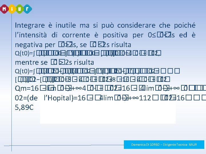 Nella prima parte del punto 3, si chiedeva all’allievo di determinare le dimensioni delle costanti, ed in seguito di discutere dell’intensità di corrente, per questo non si è esplicitato il fatto che q(t) fosse la carica che attraversava una sezione del conduttore nell’intervallo di tempo [0, t], cosa invece evidenziata all’inizio del punto 4. Un allievo che avesse ragionato un po' in più, avrebbe potuto spiegare la cosa senza usare gli integrali, altrimenti anche usando l’integrazione il risultato sarebbe stato lo stesso. Quindi, in realtà, non era necessario aver svolto gli integrali Domenica DI SORBO – Dirigente Tecnico MIUR