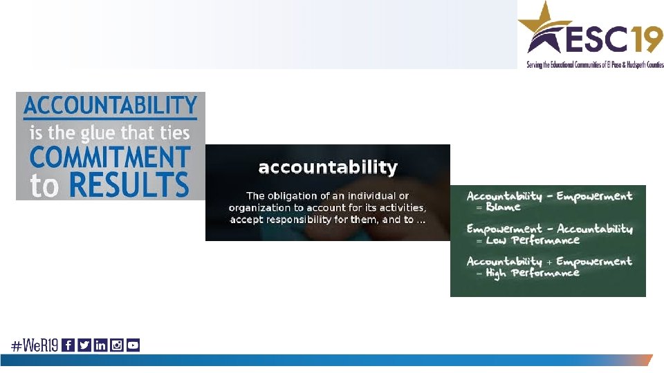 DEPARTMENT MEETING FOLLOW UP “If you cannot coherently defend data driven instruction in a minute or less, then all stakeholders will be less likely to accept it. ” (Driven by Data, pg. 115) q Your tasks: q Create a your departments’ 1 minute sales pitch to sell data driven instruction to a campus. q Given the current projections on the A F accountability system, what are the key action steps around a data driven culture that we, as an ESC, are going to implement in your department work? q Please complete your sales pitch and action steps this afternoon in your department meetings. This will be presented at the next turnaround team meeting by your representative.