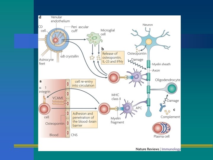 Inmunopatogénesis Componente autoinmune CD 4/8, Autoanticuerpos que atacan sustancia blanca Proteína básica de la mielina Oligodendrocito Citocinas proinflamatorias IL-2, FNT alfa, INF gamma Reacción mediada por linfocitos T, daño directo Degeneración neuronal, puede llevar a pérdida axonal Daño que puede progresar a sustancia gris