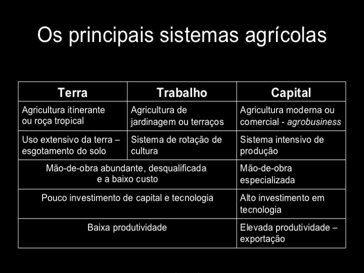 Espaço Agrário • minifúndio: esses são os grandes responsáveis pelo abastecimento do mercado interno de consumo, já que sua produção é, individualmente, obtida em pequenos volumes, o que inviabiliza economicamente a exportação; • Latifúndios por dimensão: são as enormes propriedades agroindustriais, com produção quase sempre voltada a exportação; • latifúndios por exploração: tratam-se dos imóveis rurais improdutivos, voltados a especulação imobiliária. O proprietário não adquiriu a terra com a intenção de nela produzir, gerar emprego e ajudar o país a crescer, mas para esperar sua valorização imobiliária, vende-la e ganhar muito dinheiro sem trabalhar; • empresa rural: propriedade com área de um a seiscentos módulos, adequadamente explorada em relação às possibilidades da região.