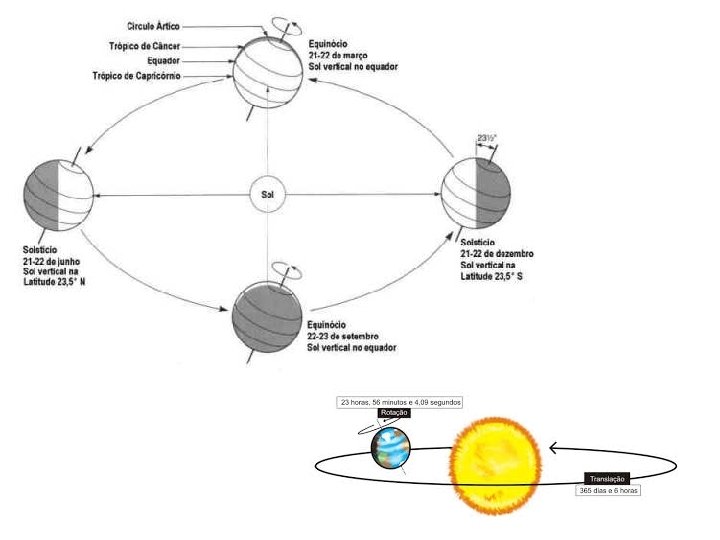 • Translação da Terra: movimento que a Terra realiza em torno do Sol, atraída pela gravidade deste. Esse movimento tem duração de 365 dias e 6 horas (a cada 4 anos essas horas a mais somam 1 dia que é colocado no mês de fevereiro, como dia 29. Quando isto ocorre o ano é chamado de ano bissexto, pois possui 366 dias). O movimento de translação, associado com a inclinação do eixo de rotação da Terra em relação ao seu plano orbital em torno do Sol determina as estações do ano, em função da distribuição desigual de luz fornecida pelo Sol nas diferentes regiões da Terra ao longo do ano. O eixo da Terra está inclinado de cerca de 66, 5º com relação a seu plano orbital