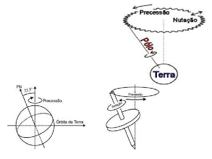 Precessão e Nutação: durante seu movimento anual orbital em torno do Sol, o eixo de rotação da Terra não permanece exatamente apontando para uma mesma direção do espaço. A Terra, num período de cerca de 26 mil anos, realiza um movimento no qual seu eixo parece descrever, aproximadamente, a superfície de um cone em torno de uma direção fixa no espaço. A esse movimento do eixo de rotação da Terra dá-se o nome de movimento de precessão. Por causa desse movimento, o pólo norte do eixo da Terra aponta para direções diferentes com o passar do tempo. Se o eixo apontar para uma estrela, ela passa a se chamar Estrela Polar. As chamadas estrelas polares variam com o tempo. Na verdade, o eixo de rotação não descreve um movimento que coincide com a superfície de um cone de base circular. O eixo oscila levemente em torno de uma circunferência. Esse movimento oscilatório do eixo de rotação da Terra recebe o nome de Movimento de Nutação. A nutação, com os atuais conhecimentos, é um conjunto de 106 componentes, mas que tende a aumentar de número conforme as pesquisas avancem em precisão. Pode-se dizer que a nutação é a componente de pequeno período da precessão