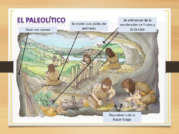 Características del Paleolítico En busca de la caza Los primeros humanos eran nómadas, no vivían siempre en el mismo lugar. Cuando se terminaban los alimentos donde vivían, buscaban otro sitio donde cazar y recolectar y otra cueva donde vivir. La vida en las tribus Al principio, las personas vivían todos juntos en tribus familiares. Cazaban animales en grupo y recolectaban (cogían)los frutos que encontraban en la naturaleza. Usaban herramientas de piedra y hueso para cazar, pescar y coser las pieles. El gran descubrimiento del Paleolítico fue el fuego. También pintaban en las cuevas, se llaman pinturas rupestres.