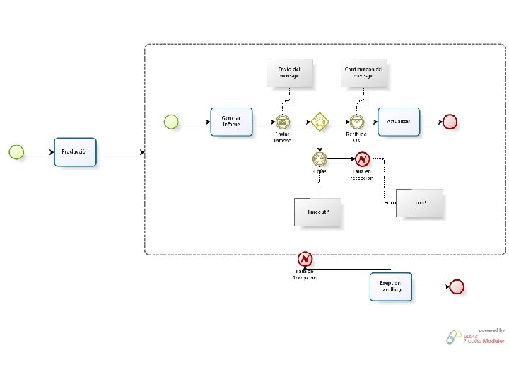 BPMN: Gateways (compuertas) Las gateways son puntos de decisión para canalizar el flujo • Exclusive Data-Based: una o varias salidas son posibles pero solo una condición dirigirá el flujo. • Exclusive Event-Based: igual que el caso anterior pero escogerá la primera condición que le llegue (race). • Inclusive: evalúa dos o más condiciones, el flujo puede salir por una o más ramas en paralelo. • Complex: sirve para combinaciones de las otras gateways, se escribe en un detalle aparte su comportamiento en cada caso particular. • Paralel: sincroniza los flujos que salen de manera paralela.