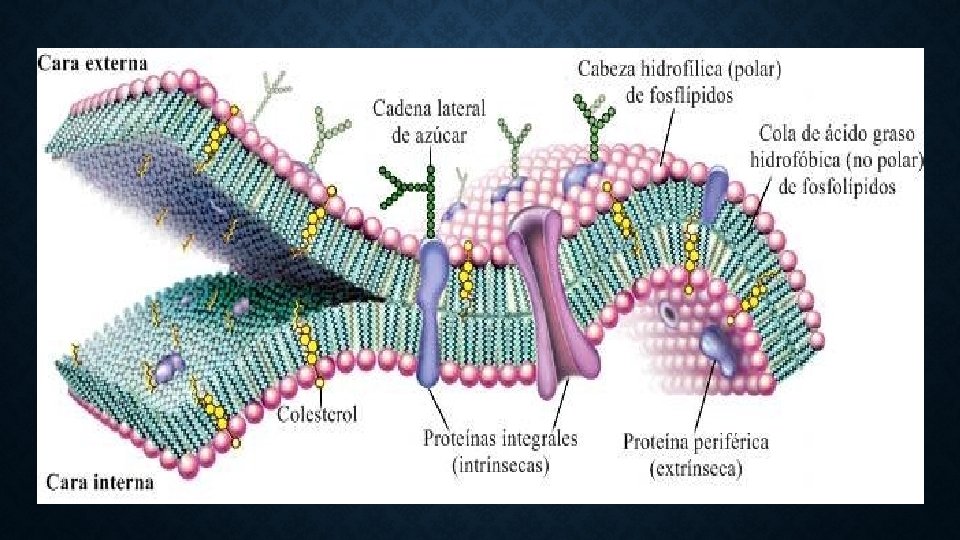 MEMBRANA CELULAR • También llamada membrana plasmática, citoplasmática o plasmalema. • Es una estructura elástica, fina y flexible de un grosor de 7. 5 nm – 10 nm. • Esta compuesta por una bicapa de lípidos con incrustaciones de proteínas, fosfolípidos y carbohidratos.